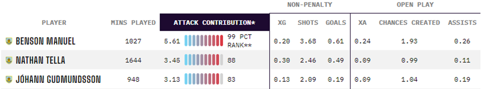 По количеству ожидаемых забитых (xg = 1,27 за матч) и пропущенных (xga = 0,96 за матч) голов «Бёрнли» занимает 5-е и 3-е места в лиге.