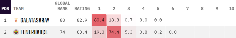«Фенербахче» в текущем сезоне вряд ли способен побороться за чемпионство. Вероятность сместить «Галатасарай» с первой строчки турнирной таблицы мизерная и составляет всего 19,3% (по данным Opta).