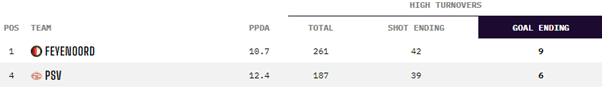 По количеству ожидаемых забитых (xg = 36,4) и пропущенных (xga = 17,4) голов «Фейеноорд» занимает 3-е и 1-е места соответственно.