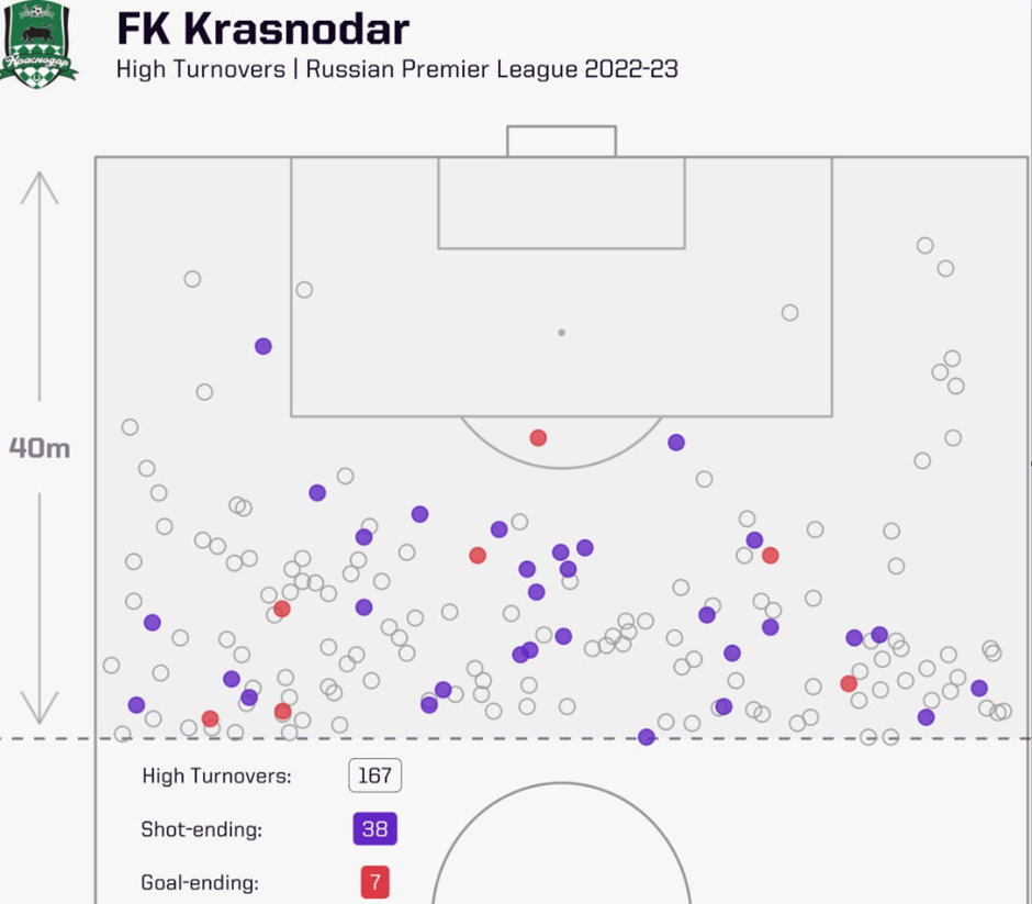 «Краснодар» после рестарта сезона здорово прибавил в финальной трети поля. Под руководством нового главного тренера – Владимира Ивича «быки» стали чаще применять высокий, интенсивный прессинг. Об это как нельзя лучше говорит 1-е место в РПЛ по количеству голов (7), которые были забиты в результате возврата владения в 40 метрах от ворот противника.