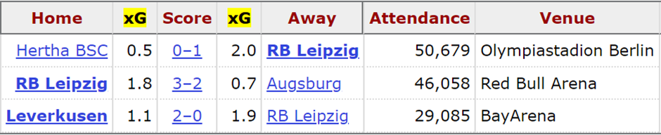 «Лейпциг» преодолел свой небольшой игровой кризис, пиком которого является разгромное поражение от «Майнца» (0:3) в 26-м туре. В каждом из последующих 3 матчей «красные быки» создали около 2 xg и значительно превзошли своих оппонентов по этому показателю. В том числе они смотрелись предпочтительнее мощного «Байера» (0:2), но подвела реализация.