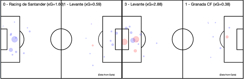 Стоит отметить, что на своем поле «Леванте» играет более внимательно в обороне, о чем говорят лишь 31,8% пропущенных голов. Даже «Гранада», которая обладает лучшей атакой в чемпионате смогла организовать только 0,38 xg в 23-м туре.