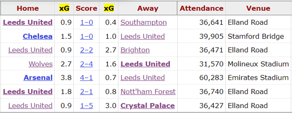 В последних 7 турах игрой команды руководит испанский тактик – Хавьер Грасия. Под его началом клуб смог одержать 3 победы при 1 ничье. Однако назвать такие результаты прогрессом можно лишь с натяжкой. «Лидс» пока что не может составить конкуренцию превосходящим его соперникам, а с прямыми конкурентами выступает не всегда стабильно. Лишь в одной игре из 7 команде удалось серьезно превзойти своего оппонента по метрике ожидаемых забитых голов (xg). При этом допущенные 2,7 xg от «Вулверхэмптона» (4:2) и 3 xg от «Кристал Пэлас» (1:5) явно сигнализируют о проблемах в обороне.