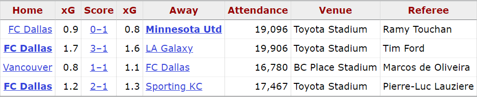 «Даллас» после поражения в дебютном матче от «Миннесоты» (0:1) смог реабилитироваться и добыть 7 очков из 9 возможных в следующих турах. Однако стоит учитывать, что победы на своем стадионе над «Лос-Анджелес Гэлакси» (3:1) и «Спортингом» (2:1) были добыты за счет небольшого везения.