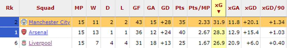 На данный момент «небесно-голубые» – идеально сбалансированная команда, лидирующая как по ожидаемым забитым (xG = 31,9), так и по ожидаемым пропущенным голам (xGA = 11,8).
