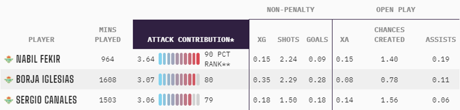 В среднем за матч «Бетис» создает 1.5 xg при допущенных 1,26 xg.