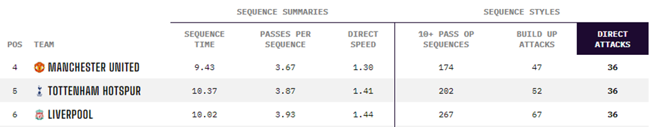 «Манчестер Юнайтед» не пытается интенсивно и высоко прессинговать, а делает ставку на быстрый переход из обороны в атаку о чем свидетельствует наибольшее в лиге количество прямых атак.