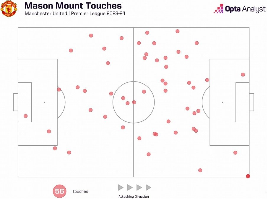 «Манчестер Юнайтед» одержал победу в дебютном туре против «Вулверхэмптона» (1:0), но назвать ее заслуженной нельзя. «Волки» создавали более острые моменты и не уступили по количеству ожидаемых забитых голов (xg). Во второй игре «красные дьяволы» оказались слабее «Тоттенхэма» (0:2). Стоит отметить, что Мейсон Маунт сделал наименьшее количество касаний (56) среди всех игроков «Манчестер Юнайтед», которые провели на поле хотя бы час в сезоне 2023-24. Это как нельзя лучше подчеркивает проблемы с работоспособностью системы Эрика тен Хага.