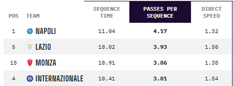 «Монца» в своей игре делает акцент на владение мячом (55,1%). Только «Фиорентина» (57,8%) и «Наполи» (60,3%) имеют показатели выше. Ставка делается на комбинационный стиль с большим количеством передач за одно владение и постепенным наращиванием давления на ворота соперника.