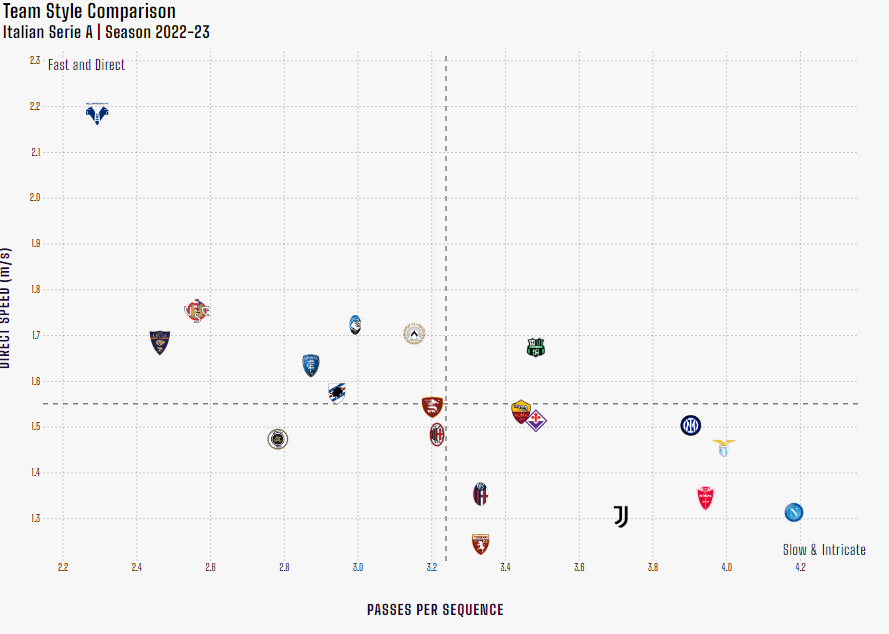 На данный момент лучшая команда Италии, занимающая первое место в Серии А. По допущенным моментам «Наполи» идёт на 2 месте(12.03 xGA), по созданным - на первом (27.63 xG - ожидаемое количество забитых голов). Стиль команды построен на владении мячом (60% в среднемза матч), высоком прессинге и постепенном наращивании давления на ворота соперника с наибольшим в лиге количеством передач за одно владение.