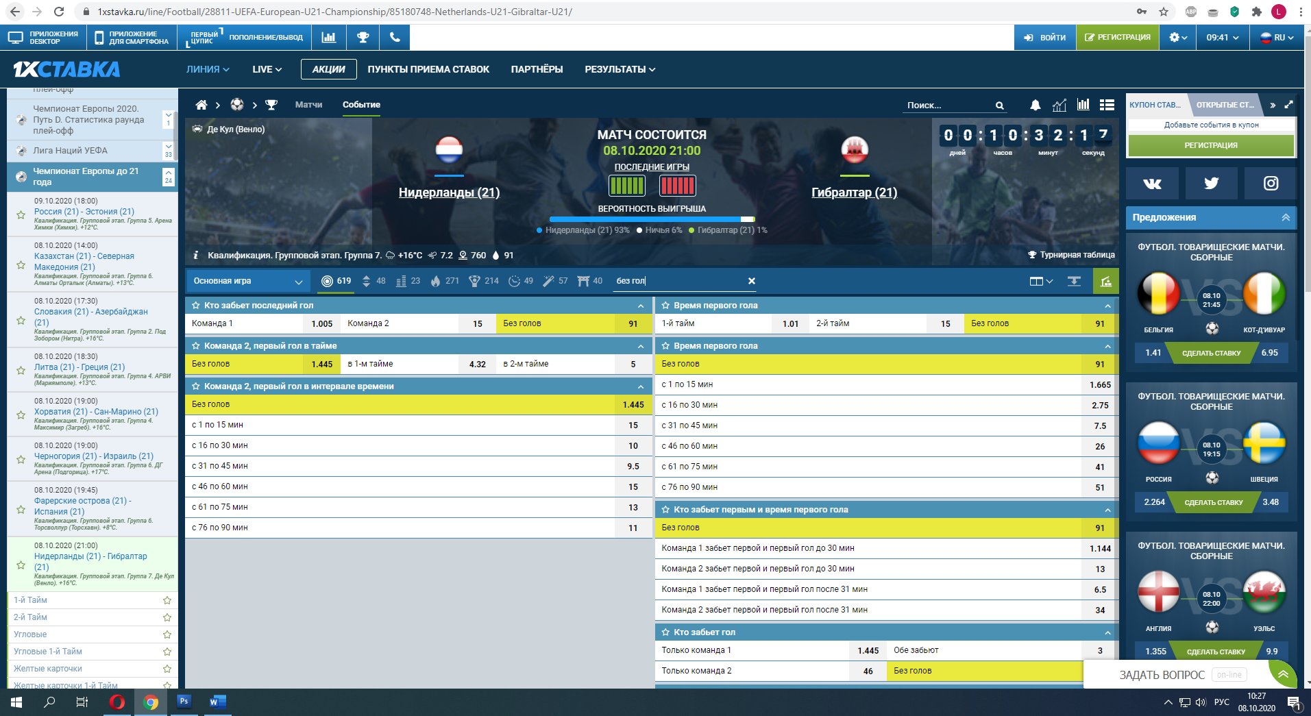 В матче Нидерланды (21) – Гибралтар (21) не нужно быть супер аналитиком, чтобы предположить, что гости не смогут забить. По моему мнению, на такие позиции нужно давать коэффициент 1,1, так как Гибралтар (21) забивает по большим праздникам. Как писал ранее, коэффициент на данный исход прыгает, с утра было 1,65, сейчас 1,45, но всё играемо и выглядит очень железно. На сегодняшний день я не могу представить даже случайного гола от сборной Гибралтара (21).