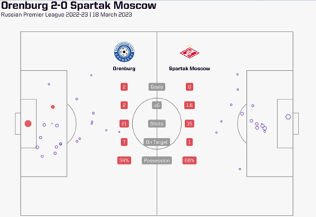 По ожидаемым забитым голам (xg = 1,71) «Оренбург» уступает только «Зениту», «Спартаку» и ЦСКА. Однако по количеству ожидаемых пропущенных голов (xga = 1,69) он плетется на 3-м месте с конца.