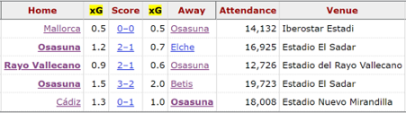 «Осасуна» проводит шикарный сезон, а в последнее время прыгает выше своей головы. Она одержала 3 победы в заключительных 5 турах, проиграв только «Райо Вальекано» (1:2). Однако этот результат нельзя назвать закономерным. Лишь в игре против явного аутсайдера – «Эльче» (2:1) «красные» значительно превзошли своего оппонента по xg.
