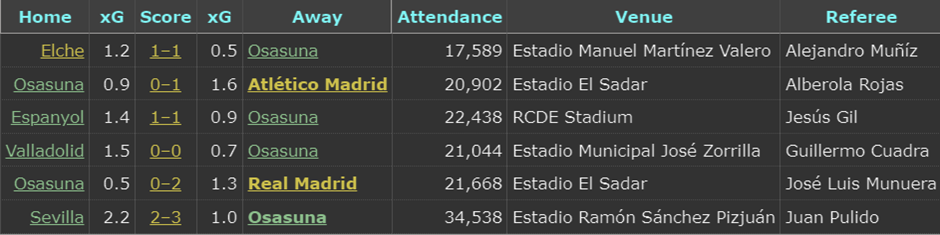 «Осасуна» предпочитает действовать, исходя из ошибок соперника и полагаясь на свою крепкую оборону. По количеству ожидаемых пропущенных голов (xga = 1,03) она входит в квартет сильнейших в Примере. Но за это «красные» расплачиваются низким атакующим потенциалом (xg = 1,03 – 5-е место с конца).