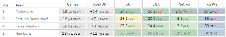 По ожидаемым забитым (xg = 26,1) и пропущенным (xga = 20) голам «F95» идет на 4-м и 3-м местах в чемпионате соответственно, а по их разнице (xg Diff = +6,1) уступает только «Гамбургу» (10,5) и «Падерборну» (14,7).