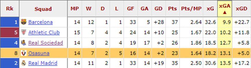 «Осасуна» после 14 туров идет на 8-м месте в Примере, имея 23 очка. Отличительной особенностью «красных» является надежная оборона. По количеству ожидаемых пропущенных голов команда входит в четверку лучших.