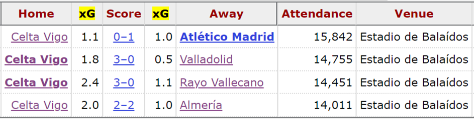 В среднем за матч в обозначенном промежутке времени «Сельта» генерирует 1,43 xg при допущенных 0,89 xg, что свидетельствует о превосходном балансе. Примечательно, что ни в одном домашнем матче при Карвальяле клуб не уступил своим соперникам по xg.