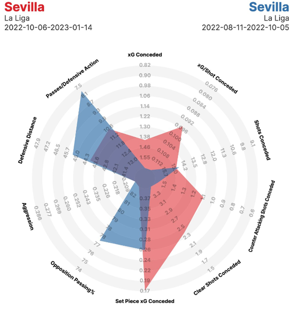 Сампаоли опустил линию обороны на полтора метра ниже (44 метра против 45,5) и уменьшил интенсивность прессинга. Благодаря этому команда стала более устойчива к контратакам, а оборона в целом улучшилась.