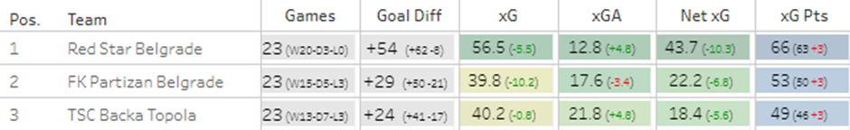 По ожидаемым забитым (xg = 2,43) и пропущенным (xga = 0,56) голам «Црвена Звезда» занимает лидирующие позиции и на порядок сильнее любого клуба Суперлиги.