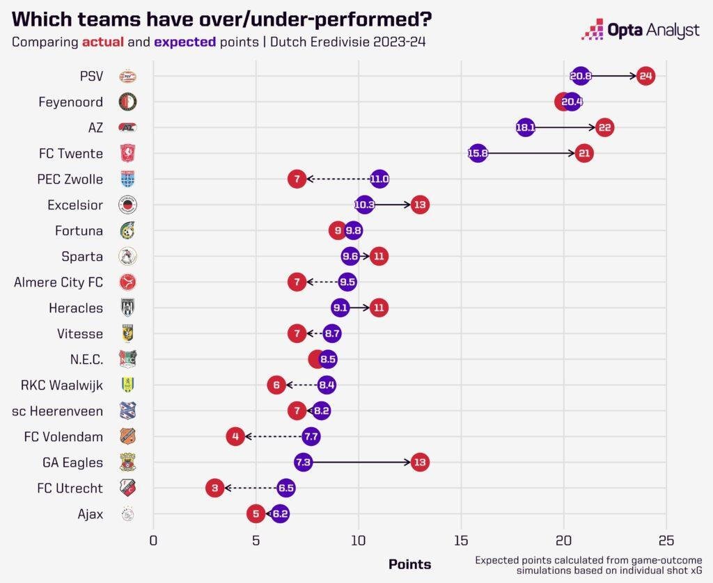 «Аякс» занимает 16-ю позицию в чемпионате, что является худшим результатом клуба за более чем 35 лет (с августа 1988-го года). Еще больше расстраивает тот факт, что по ожидаемым набранным очкам (xPts = 6,2) ему еще повезло, так как он должен идти на последнем месте. Встреча с еще одним разочарованием сезона – «Утрехтом» является отличным шансом для легендарного клуба переломить негативную тенденцию.