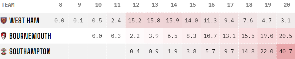 «Саутгемптон» является главным претендентом на вылет во второй дивизион. На дистанции в 26 игровых дней он занимает последнее место в АПЛ, а вероятность его понижения в классе составляет 77,5% (по данным Opta).