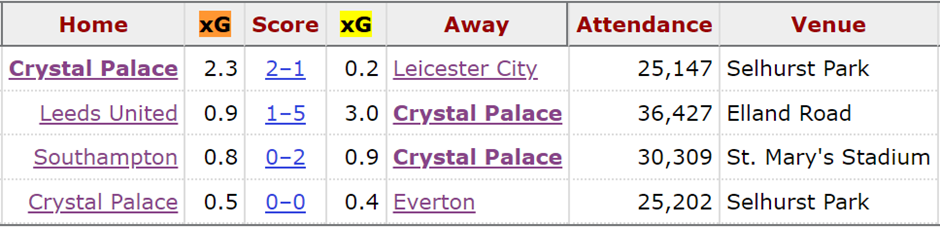 Несмотря на впечатляющие победы в первых двух матчах над «Лестером» (2:1) и «Лидсом» (5:1), заключительные 2 игры получились менее продуктивными. «Саутгемптону» (2:0) и «Эвертону» (0:0) удалось подавить возросший атакующий потенциал «орлов». Примечательно, что этот матч является уже 5-м по порядку против клубов, которые борются за выживание.