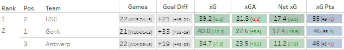«Юнион Сент-Жиллуаз» занимает второе место в Высшей лиге Бельгии и опережает своего актуального оппонента на 6 очков. По ожидаемым забитым (xg = 39,2) и пропущенным (xga = 21,8) голам команда занимает 2-е место в чемпионате, а по их разнице (xg Diff = 17,4) делит 1-ю позицию с «Генком».