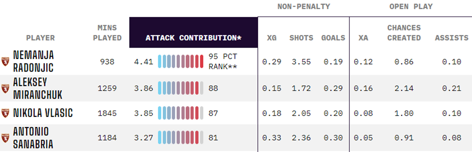Предстоящую встречу пропустит Влашич (4+2), но есть Миранчук, который в последнее время в форме и лидирует по созданным моментам.