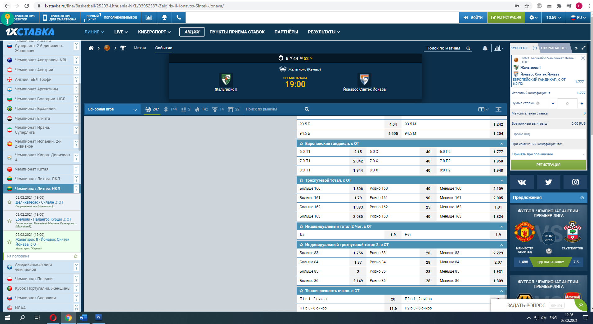 Победа «Йонавос Синтек Йонава» с форой (-6,5) – это тоже самое, что и Европейский гандикап – 6:0 П2, просто на последнее более выгодный вариант ставки.