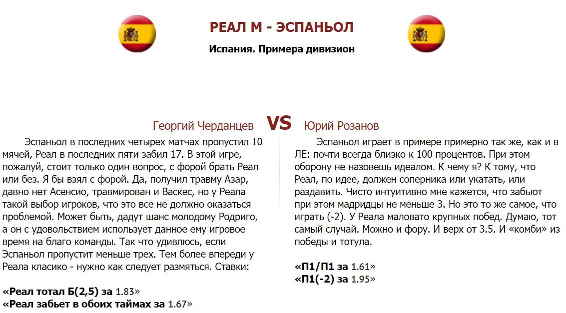 Количество забитых мячей в последних пяти матчах неуклонно снижается у Реала (6-4-3-2-2), Эспаньол в чемпионате пропускает в среднем меньше 2 голов за матч, хотя в последнем туре сильно осасунился и пропустил 4. Реал не Осасуна, поэтому брать его с форой или нет здесь вообще не стоит. Я выкинул эту мысль из головы сразу, потому что у Реала травмированы Азар, Асенсио, Марсело, Хамес и уэльский гольфист – и это проблема. Может быть, дадут шанс старому Кариму, но он как всегда без удовольствия бездарно истратит в пустую данное ему игровое время на благо команде соперника. Так что без шансов для Реала забить больше двух. Тем более у Реала на неделе классика – залечь на дно в Брюгге перед Эль Класико.