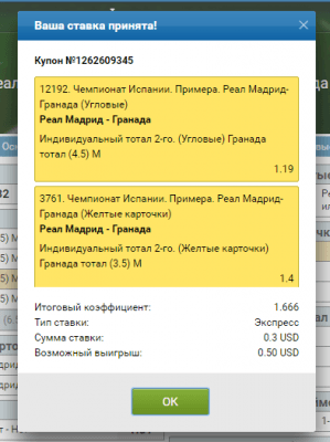 Желтые карты. Здесь ставка исходит от арбитра матча - Иньяки Виканди Гарридо. Коэффициент на общий ТМ желтых карт уже прогружен и не рентабелен, поэтому я решил взять вариант с индивидуальным тоталом "Гранады". В последних 5 матчах на "Сантьяго Бернабеу" "Гранада" ни разу не пробивала данный тотал, в среднем на выезде получает 3,25 ЖК за матч, а уж с учетом "фактора Иньяки", эту цифру можно разделить на 2.
