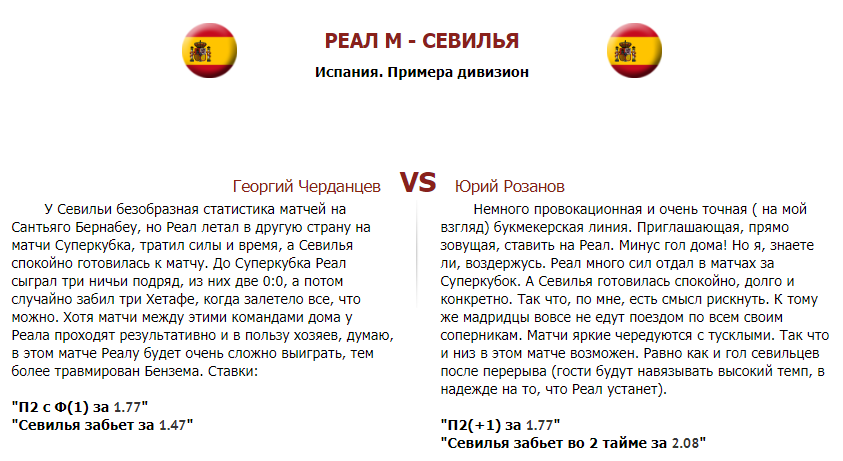 У Севильи отменная статистика матчей на Сантьяго Бернабеу. Но Реал просто летал по полю в матче за Суперкубок Испании, особенно в дополнительное время. А полёт Вальверде (не Эрнесто) был просто незабываемым. Севилье пришлось съездить в другой город на матч Кубка Испании, тратить силы и время, а Реал спокойно, играючи, не напрягаясь, готовился к матчу, попутно обыгрывая Атлетико. Кто старый год помянет, тому вторую ипотеку в подарок – следуя этой поговорке и опираясь на текущую форму Реала, а также принимая во внимание отменную результативность Реала в домашних матчах против Севильи, я уверен, что в этом матче Реалу будет очень легко выиграть, тем более без Бензема.