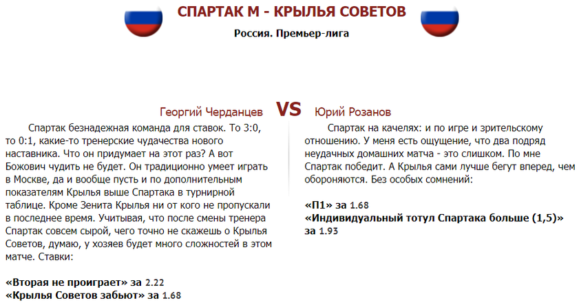 Спартак и надежда – вот две материи, которые нужны, чтобы путешествовать по вселенной ставок. 3:0 и 0:1 - это не чудеса в Арденнах, а результаты Спартака при новом наставнике. Он же абсолютно ничего не придумывает, а вот Божович выдумщик ещё тот. Он, не соблюдая черчесовские традиции, ставит Соболева в основу, запретил игрокам голы пропускать от всех команд, кроме Зенита, приезжает в одну и ту же страну тренировать дважды, Крылья поставил выше Спартака в таблице - в общем, развлекается, как хочет. Учитывая, что весь сезон Спартак в атаке сухой, а в Самаре забил Крыльям аж два, то вряд ли Божович сможет запретить не пропустить в Москве.