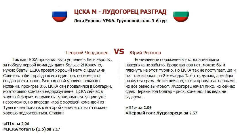 ЦСКА в этой Лиге Европы показал все, на что способен, набрав за четыре тура одно очко. И я предлагаю «железку» на этот матч: «Лудогорец» не проиграет. ЦСКА провел плохой матч с «Крыльями Советов», мало создал опасных моментов, забил всего один гол, и тот случайно. Поражение от «Эспаньола» (0:6) ничего не значит, просто «Лудогорец» съездил отдохнуть в Испанию. ЦСКА в первом матче в Болгарии показал уровень российского футбола. «Армейцы» сейчас в плохой форме, теоретический шанс выйти из группы есть. Но это ЦСКА, а значит, без шансов. К тому же, дальше — игра против тульского «Арсенала», поэтому этот матч с «Лудогорцем» не нужен ЦСКА.