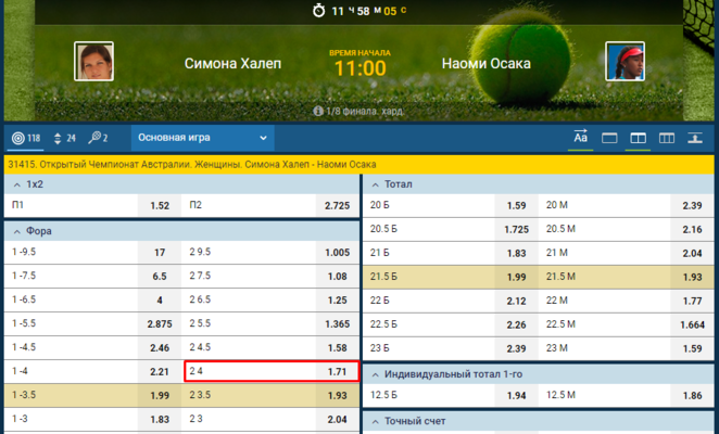 Есть две личные встречи, где с вполне здоровой Симоной японка навязывала приличную борьбу и оба раза выигрывала минимум 1 сет. Я остановлюсь на форе +4 и склоняюсь к победе девушки из Японии. Халеп боец, но в виду объективных причин ее шансы ниже, чем нам выставляет букмекер.