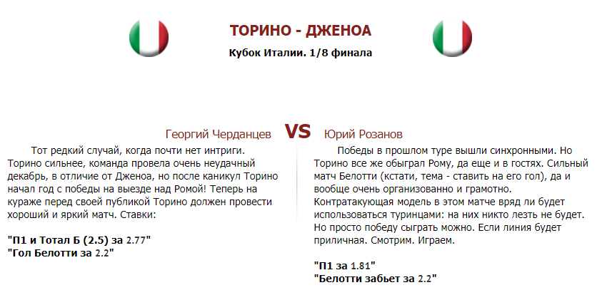 Тот весьма нередкий случай, когда в матче есть интрига. Тут же не Спартак играет, в матчах с участием которого всё ясно. Торино слабее, команда провела очень удачный декабрь, сравнивать с Дженоа мы тут не будем, но после каникул победила на выезде Рому, что я лично считаю неудачным результатом. Куража у Торино нет, да и этот матч придётся играть уже перед своими болельщиками, поэтому Торино должен провести плохой и скучный матч.