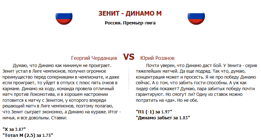 Думаю, что «Динамо» проиграет в этом матче, а может, и выиграет. Что-то я запутался. В общем, ничьей точно не будет. «Зенит» отдохнул в Лиге чемпионов, преимущество перед соперниками в чемпионате у него так себе. Если питерцы проиграют, то уйдут в отпуск с плюс пять очков отрыва, а это не так много. Ведь за зиму из «Локомотива» может уйти Эдер, и тогда москвичи смогут навязать борьбу. «Динамо» показало плохую игру против «Локомотива», но смогло выиграть за счет удачи. Поэтому «Зенит» может выиграть на классе, а «Динамо» случайно может выиграть. Ну а ничьей тут просто быть не может. В общем, веселый матч будет!